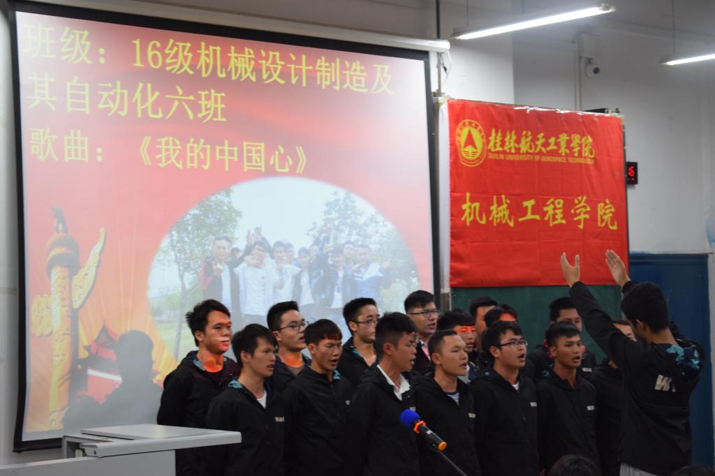 随着参赛的班级陆陆续续的来到教室,歌咏比赛开始了,本次歌咏比赛以班级为参赛单位,共有17个班级,经过筛选,8支队伍脱颖而出,闯进决赛。各参赛队演唱了《我的中国心》、《走向复兴》、《祖国不会忘记》等耳熟能详的爱国歌曲,用激情嘹亮的歌声抒发了对党、对祖国、对学校的热爱之情,用饱满的热情喜迎"十九大"召开。最终2016级飞制一班用他们那响亮而又整齐的声音唱《精忠报国》,唱出他们那爱国的心,震撼全场,从而以93分最高成绩获得了第一名。