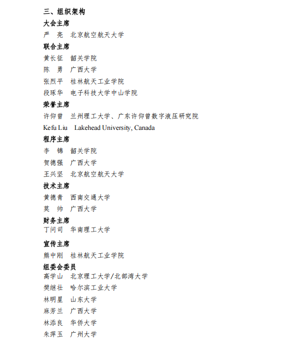 协办单位:北京航空航天大学、广西大学、桂林电子科技大学、广东许仰曾数字液压研究院、广西新能源车辆动力电池与绿色动力域重点实验室、电子科技大学中山学院、广东省智能检测与智能装备工程技术研究中心、广西特种工程装备与控制重点实验室、非标智能装备与流程控制技术广西高校工程研究中心、ESBK学术交流中心、AC学术平台