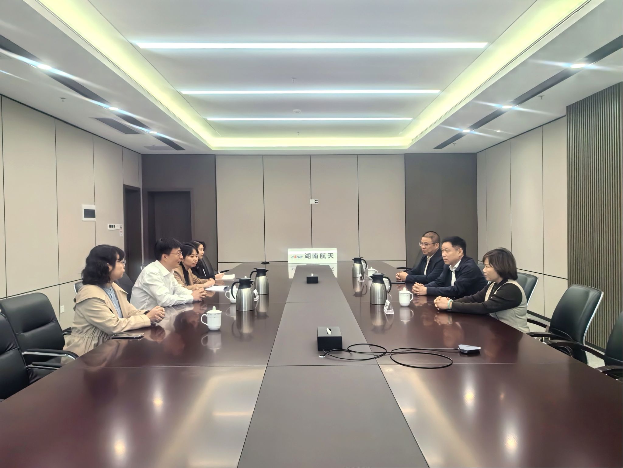 在湖南航天管理局,孙山林一行受到了党委副书记韩海彬等领导的热情接待。座谈会上,孙山林详细介绍了桂林航天工业学院近年来的发展情况以及未来的发展规划,重点介绍中国-东盟航天工程师学院建设进展,他引用习近平总书记关于新质生产力发展的重要论述,提出希望双方能在航天航空科技城项目合作建设、航空航天领域合作研发、钱学森班人才培育等方面开展深入合作,共同推动校企合作迈向新台阶。