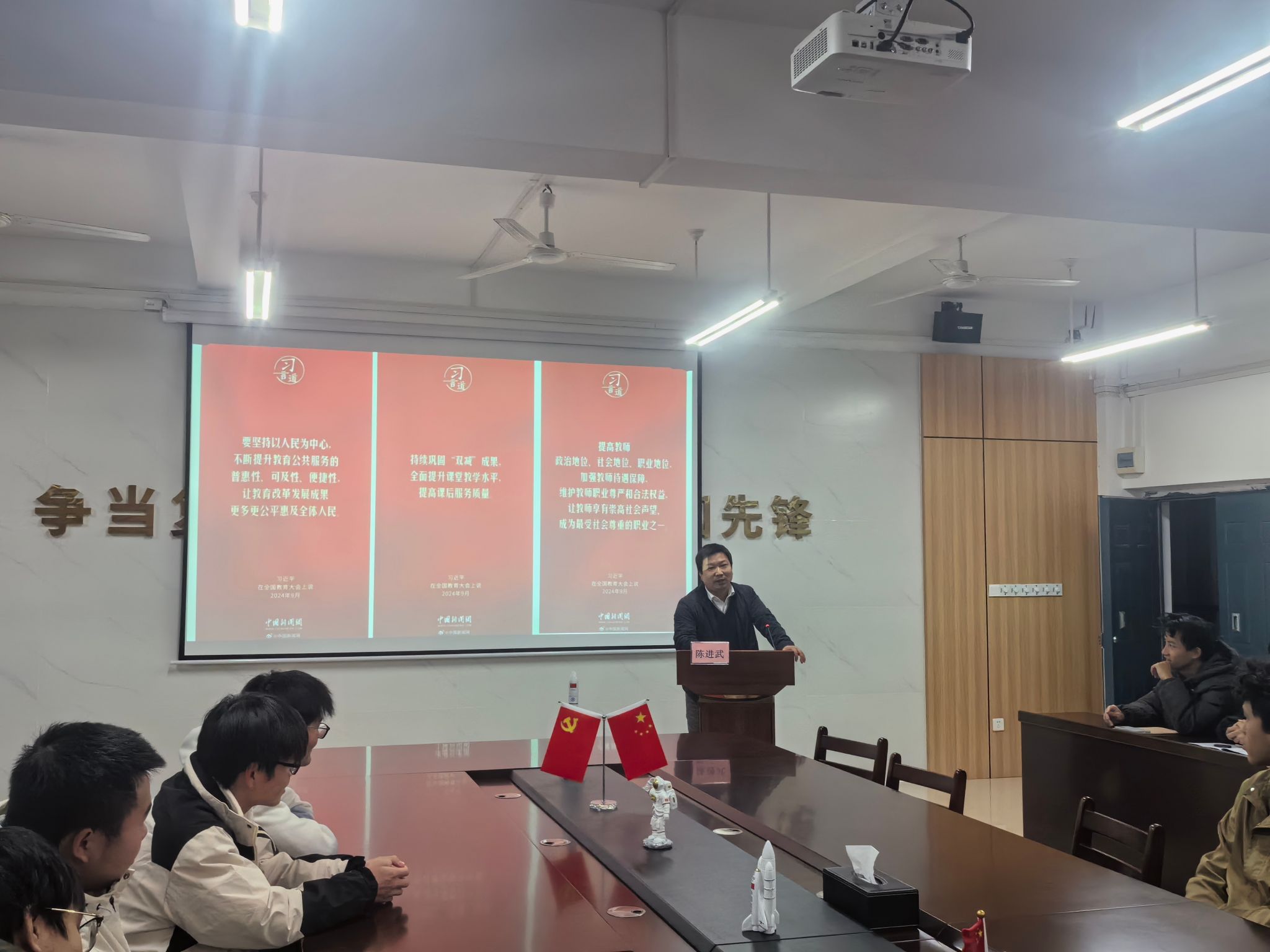 首先,陈进武带领学生们回顾了习近平总书记在全国教育大会上的重要讲话,特别是关于建设教育强国、实现中国式现代化以及高等教育立德树人的根本任务等内容。在谈到如何建设教育强国时,他指出,坚持社会主义办学方向,为国家培养德智体美劳全面发展的社会主义建设者和接班人,是每一位教育工作者的神圣使命。