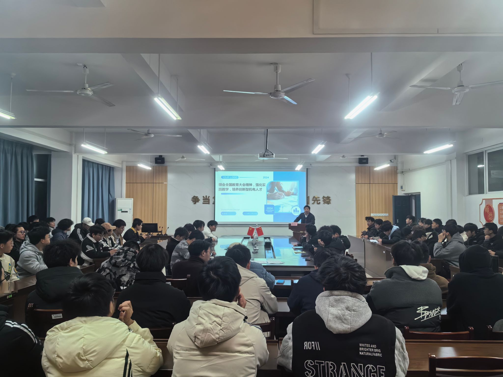12月19日,bevictor伟德官网2024年秋季学期机电思政大讲堂第五讲在巡天楼229会议室开讲。学院分管教学工作副院长陈进武以“领会全国教育大会精神,强化实践教学,培养创新型机电人才”为主题开讲,学院100余名学生聆听。