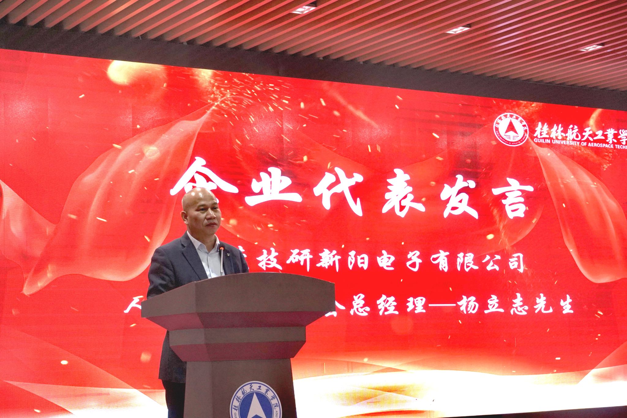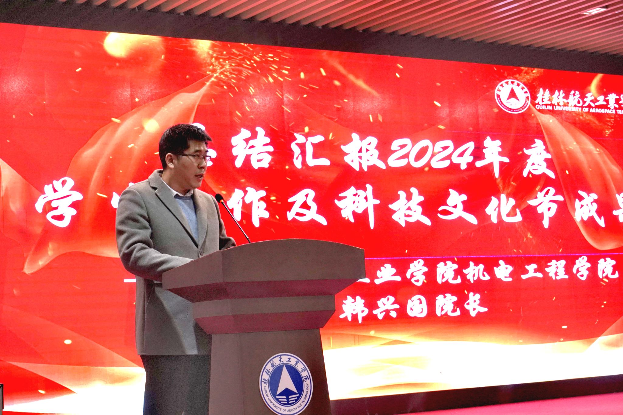 会上, 韩兴国代表学院总结汇报了2024年度学生工作及科技文化节成果。东莞技研新阳电子有限公司人力资源委员会总经理杨立志代表合作企业发言,高度赞赏桂航学子的创新精神、实践能力、航天品质,并表态将长期余桂航开展产教融合订单培养及共同举办科技文化竞赛。邵怡峰作为深圳思榕科技研发骨干代表校友发言,表达对母校培育的感恩,表态要通过自身努力擦亮桂航品牌,熊中刚教授、孙高乐同学分别代表师生发言,分享了组织和参与科技文化竞赛、订单班活动的经验体会。