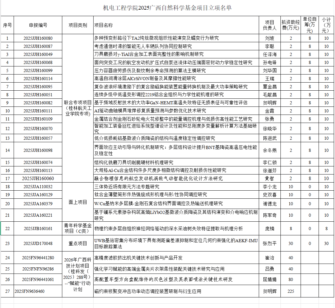 2026年广西科技计划项目评审结果揭晓,我院共获批立项27项,占全校总数86项的31.4%!其中获重点项目1项、面上项目4项、青年项目1项、联合资助项目17项。特此祝贺!