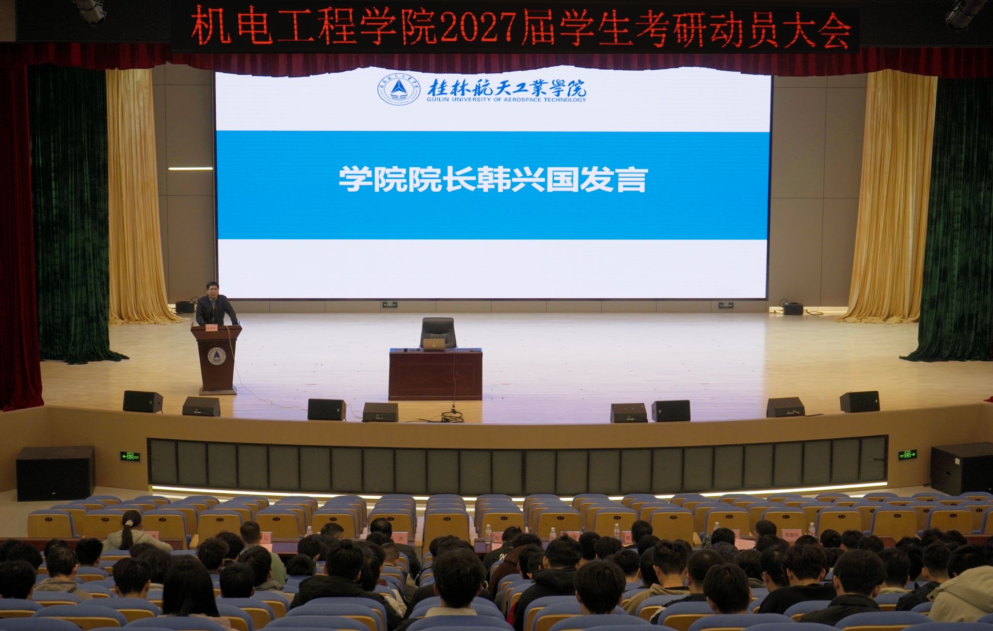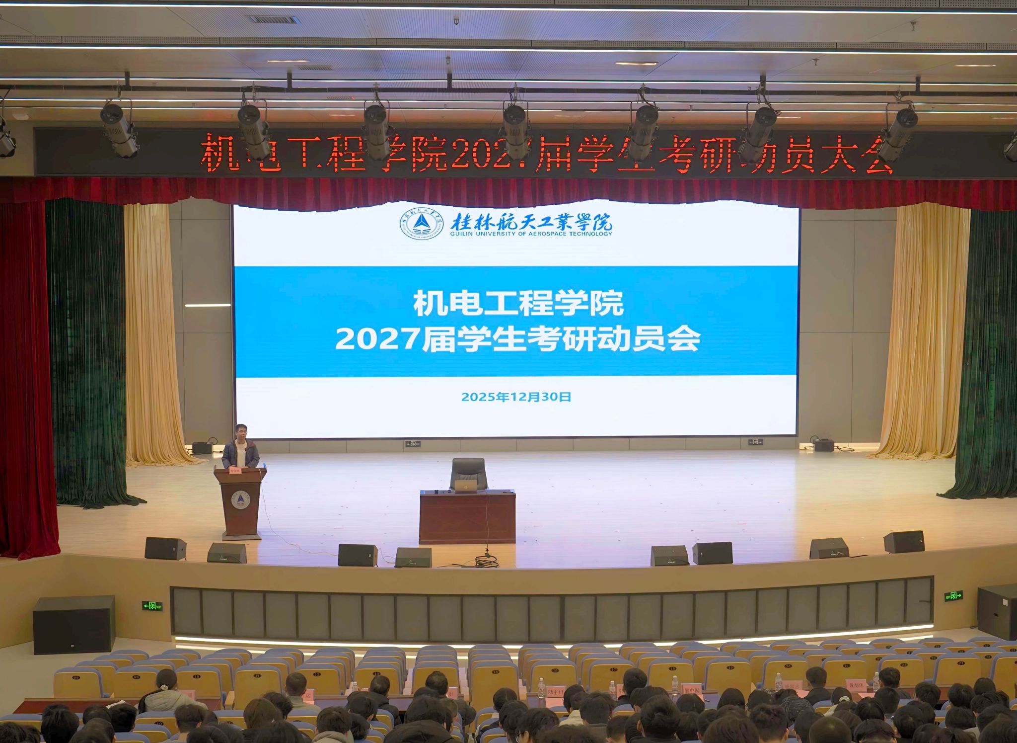 为持续深化学风建设,全面激发学生学习内生动力和考研热情,12月30日中午,bevictor伟德官网在问天楼学术报告厅召开2027届学生考研动员大会。学院院长韩兴国、党委副书记陆宇川、副院长熊中刚出席大会,各专业教师代表、2023级全体辅导员及500余名学生参会。会议特邀考取桂林电子科技大学研究生校友李亚萌、刘德清重返母校,为学弟学妹们分享考研备考的实战经验与心路历程。大会由陆宇川主持。
