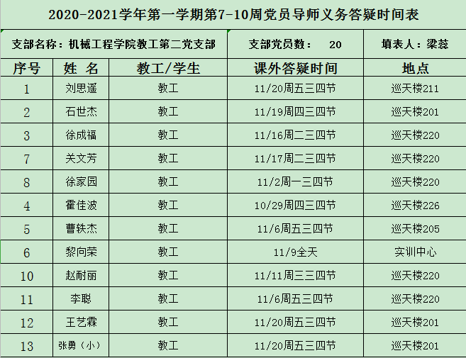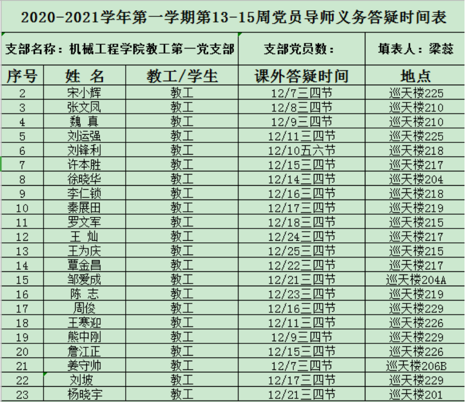 2020-2021学年第一学期第13-15周党员导师义务答疑时间表