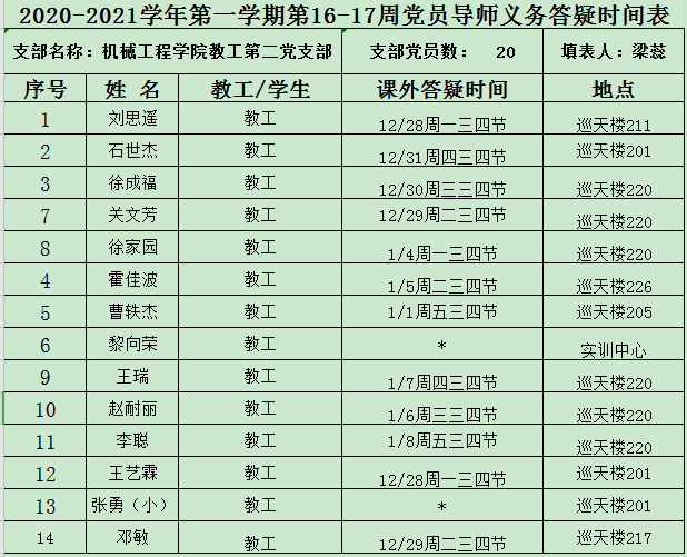 2020-2021学年第一学期第16-17周党员导师义务答疑时间表