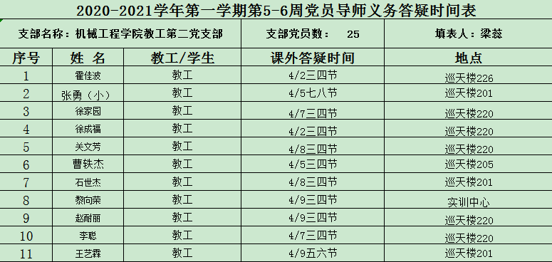2020-2021学年第二学期第5-7周党员导师义务答疑时间表