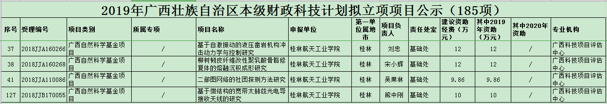 近日从广西壮族自治区科学技术厅获悉,在2019年度广西自然科学基金项目评审中,桂林航天工业学院荣获4项立项,其中我院3项项目获立项资助,合计34万。