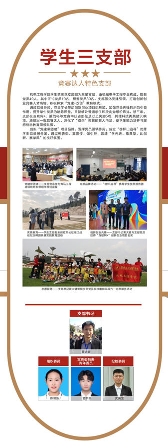 bevictor伟德官网学生第三党支部现有党员44名,由3名教师党员和41名学生党员组成,其中正式党员28名、预备党员16名,2021级学生党员33名、2022级学生党员8名。支部作为竞赛达人特色支部,始终坚持以“党建+实践”相结合,近3年来,支部在挑战杯、“互联网+”等学科竞赛中获省部级及以上奖励20余项,涌现出一批竞赛达人。同时为充分发挥党员的先锋模范作用,成立了“榜样·追寻”优秀报告学生党员团队,通过树典型、重宣传、强引导,营造出“学先进、看典型、比创新、赛学风”的良好氛围,引导并激励更多学生党员在各个领域树立新的标杆。