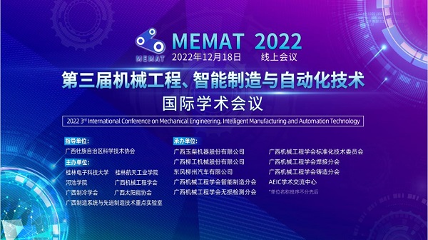 12月18日,由广西壮族自治区科学技术协会指导,在广西机械工程学会的大力支持下,学校联合桂林电子科技大学、河池学院、广西制冷学会、广西太阳能协会、广西制造系统与先进制造技术重点实验室主办,AEIC学术交流中心承办的第三届机械工程、智能制造与自动化技术国际学术会(MEMAT2022)在线上顺利举行。广西机械工程学会理事长、桂林电子科技大学副校长潘开林出席会议并为大会致辞。会议由学会常务副理事长高兴宇主持。