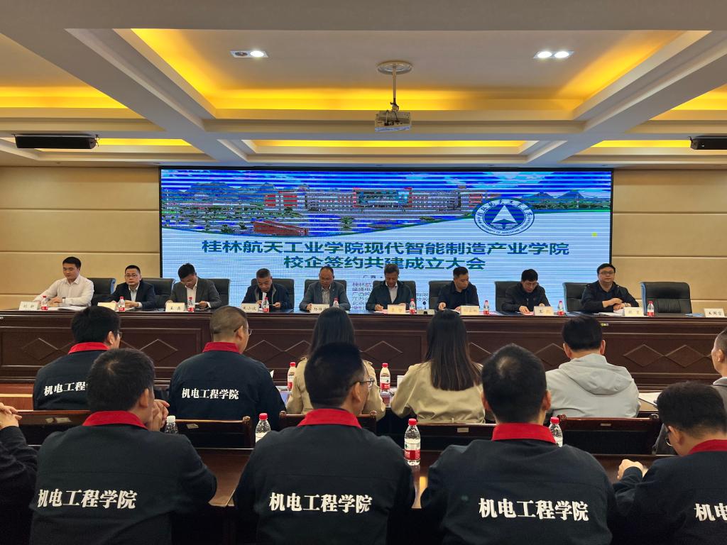 会上,五家企业分别与学校签订共建协议,孙山林宣布桂林航天工业学院现代智能制造产业学院成立。在与会成员的见证下,校企双方领导共同为“桂林航天工业学院现代智能制造产业学院”、“广西有色金属金属材料技术研究院”、“桂航-盛隆 创新创业工作室”、“江苏金彩高分子材料科技股份有限公司博士工作室”揭牌。