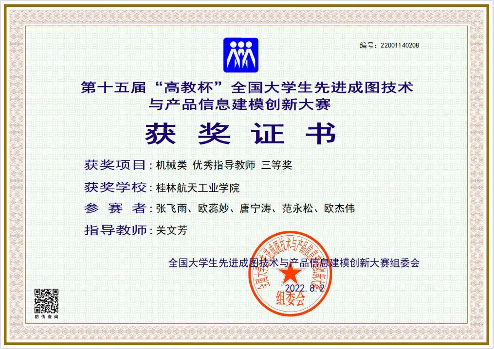 关文芳2022年第十五届“高教杯”全国大学生现金成图大赛国赛优秀指导教师三等奖