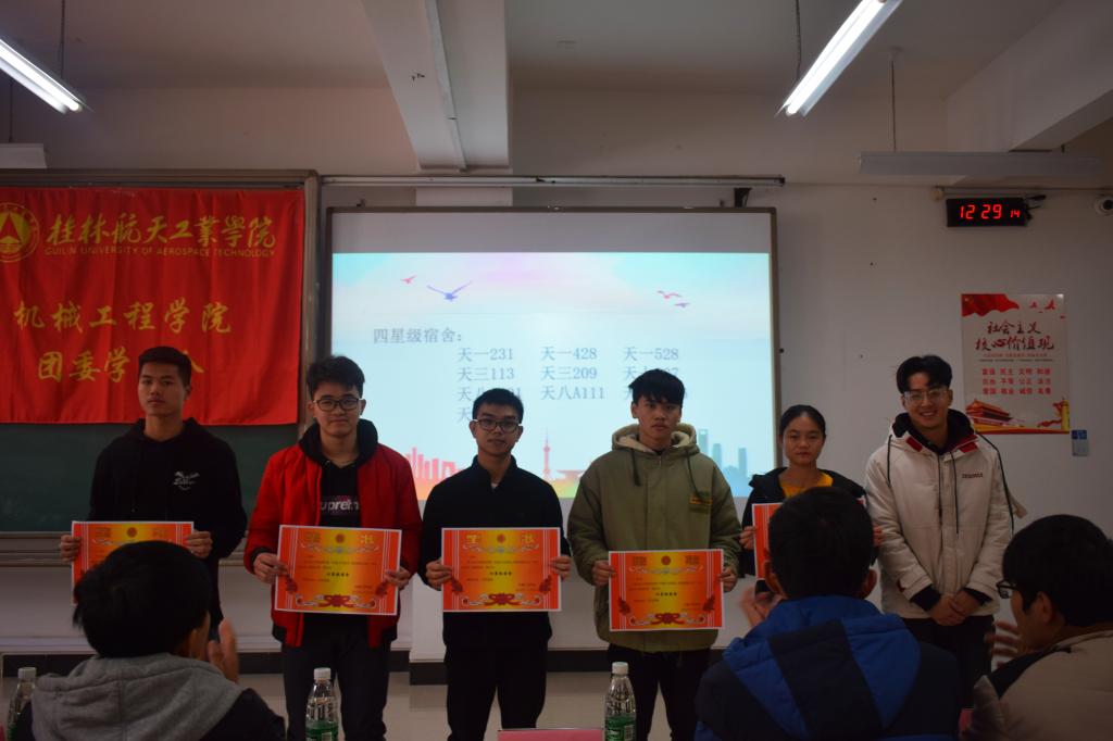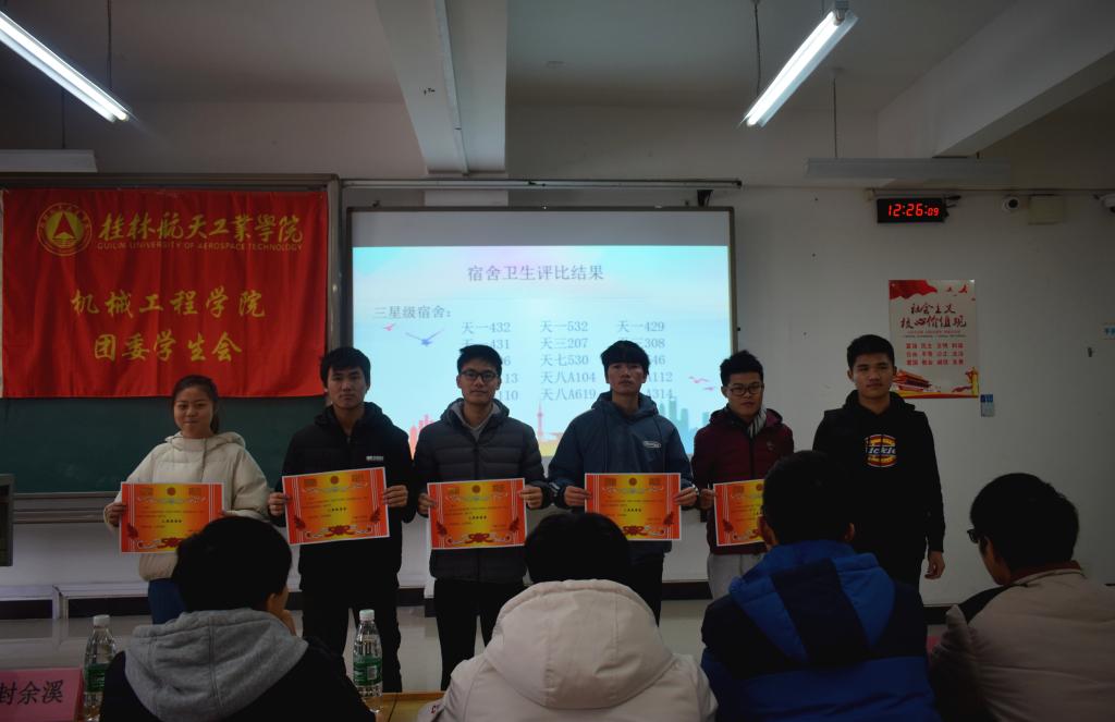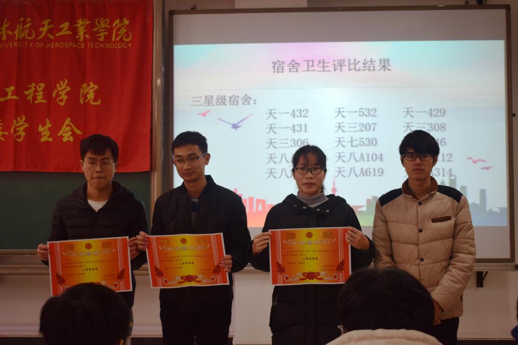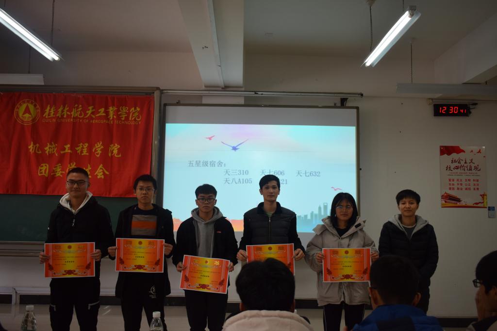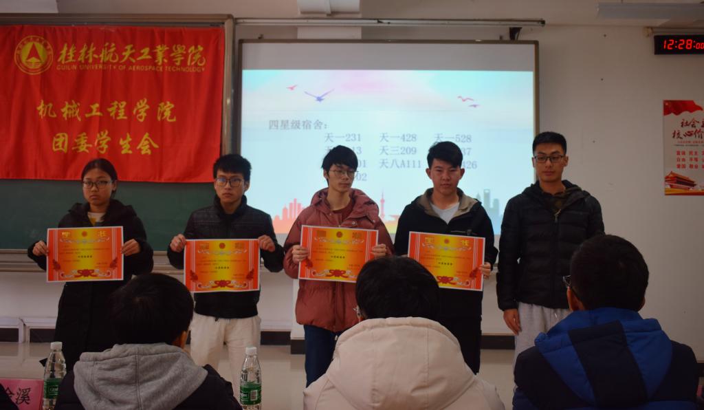 2019年12月24日12:00,我院在飞天楼212教室成功举办2019宿舍卫生评比暨宿舍文化建设活动颁奖仪式。我院原团委书记韦喆、团委副书记张荣、学生会主席封余溪、副主席刘金寿、高林、方万志、吕杰文以及获奖宿舍学生代表参加了本次颁奖仪式。