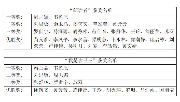 汇演通过文艺节目、PPT等展示了“做充满书卷气学生,创飘溢书香型宿舍”系列活动的风采以及出色的作品。经过精彩节目显示、摇一摇等环节,汇演逐渐进入尾声。我校公寓管理科科长黄国安、我院团委书记韦喆均对本次活动表示高度认可,对日后我院营造书香校园充满期待。最后黄国安科长、韦喆书记、梁蕊辅导员以及指导老师石颖分别对各项活动中获奖的学生进行颁奖。最终获奖名单如下表所示。