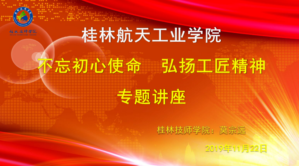 为激励我院学生励志成才、勤学本领,为进一步弘扬工匠精神,结合学校党委“不忘初心、牢记使命”主题教育,机械工程学院党总支于2019年11月22日下午14:30在致远楼223举行“不忘初心使命、弘扬工匠精神”主题讲座,本次讲座邀请了桂林技师学院机械技术应用系数控专业负责人、广西优秀教师、广西技术能手、广西五一劳动奖章获得者、国家级技能大师莫宗远老师主讲,机械工程学院部分老师及本院学生近200人参加了讲座。