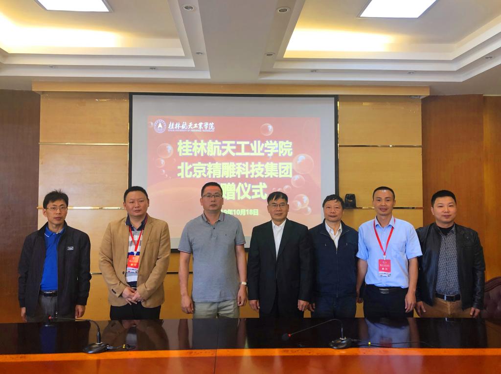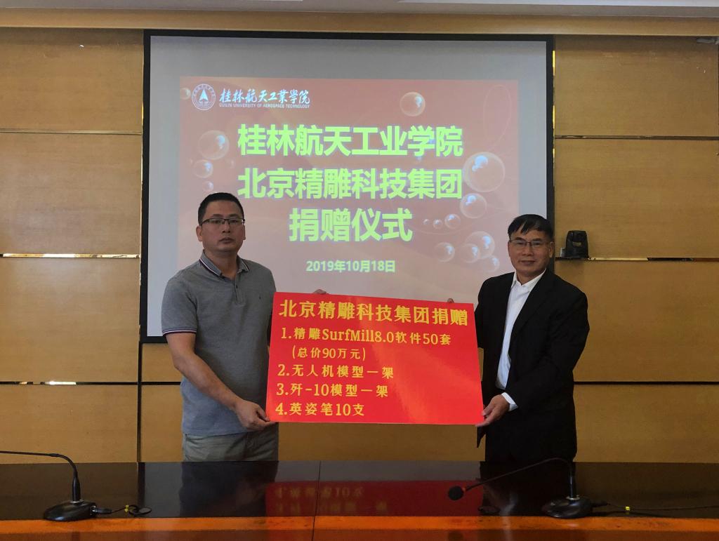 在我校建校40周年这个喜庆的日子,10月18日上午,我校与北京精雕集团捐赠仪式在学校南校区飞天楼517会议室举行,北京精雕集团捐赠价值90万的精雕SurfMill8.0软件50套、无人机模型一架、歼-10模型一架以及英姿笔10支。我校纪委书记韦冠武、学工部部长王凯、机械工程学院院长李天明、机械工程学院教研室负责人陈进武以及相关专业代表学生参加。北京精雕集团东莞市精雕职业培训第二学校校长黄波、销售部主任邱孔亮以及工程师黄毅出席。仪式由韦冠武书记主持。