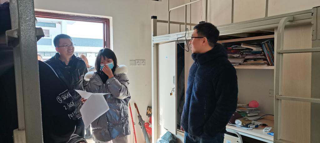 10:30,唐书记带领学院全体辅导员走入学生宿舍,共走访了天和苑1号楼、7号楼和8号楼。走访过程中,唐书记对同学们的宿舍卫生环境进行了细致地检查,并亲切地与学生交谈,了解他们近期的学习、生活情况,督促学生养成良好的作息习惯,营造良好的宿舍氛围。鼓励同学之间应团结友爱,相互督促,共同进步。唐书记还细心叮嘱同学们要注意用电安全、财产安全和出行安全,并特别强调目前全国疫情依旧严峻,督促学生要做好个人安全防护,在寒假返乡途中要佩戴口罩,尽量减少与其他人员交流,避免聚集,与同乘者尽量保持距离;寒假期间要少外出、少聚集,不前往中高风险地区。