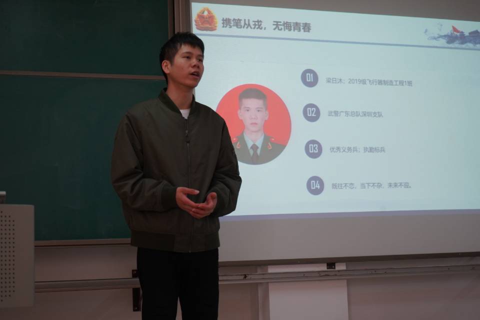 而后,退伍复学优秀学子梁日沐、龙荣勋先后上台分享了自己的参军经历,包括入伍前的思想动态,部队的生活以及退伍后的感悟。两年多的军旅生涯磨砺,铸就了他们正直坚毅的个性、严明的组织纪律性,以及严谨务实的工作作风。培养了他们严肃的工作态度和不怕吃苦、勇于拼搏的精神,军旅记忆无疑是他们人生中的一笔宝贵财富。两人的分享使台下的同学们听得肃然起敬。