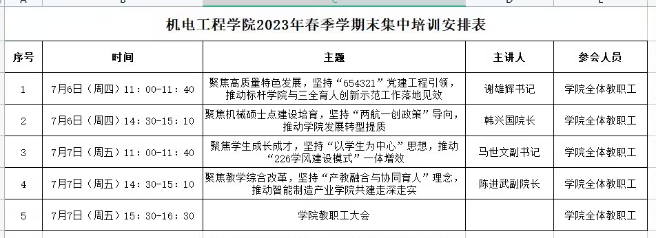 学院其他党政班子成员分别从《聚焦机械硕士点建设培育,坚持“两航一创政策”导向,推动学院发展转型提质》,《聚焦学生成长成才,坚持“以学生为中心”思想,推动“226学风建设模式”一体增效》,《聚焦教学综合改革,坚持“产教融合与协同育人”理念,推动智能制造产业学院共建走深走实》等多个专题开展培训,客观分析学院发展现状,直面问题症结,谋划发展前景,鼓励全院教职工为学院建设贡献力量。