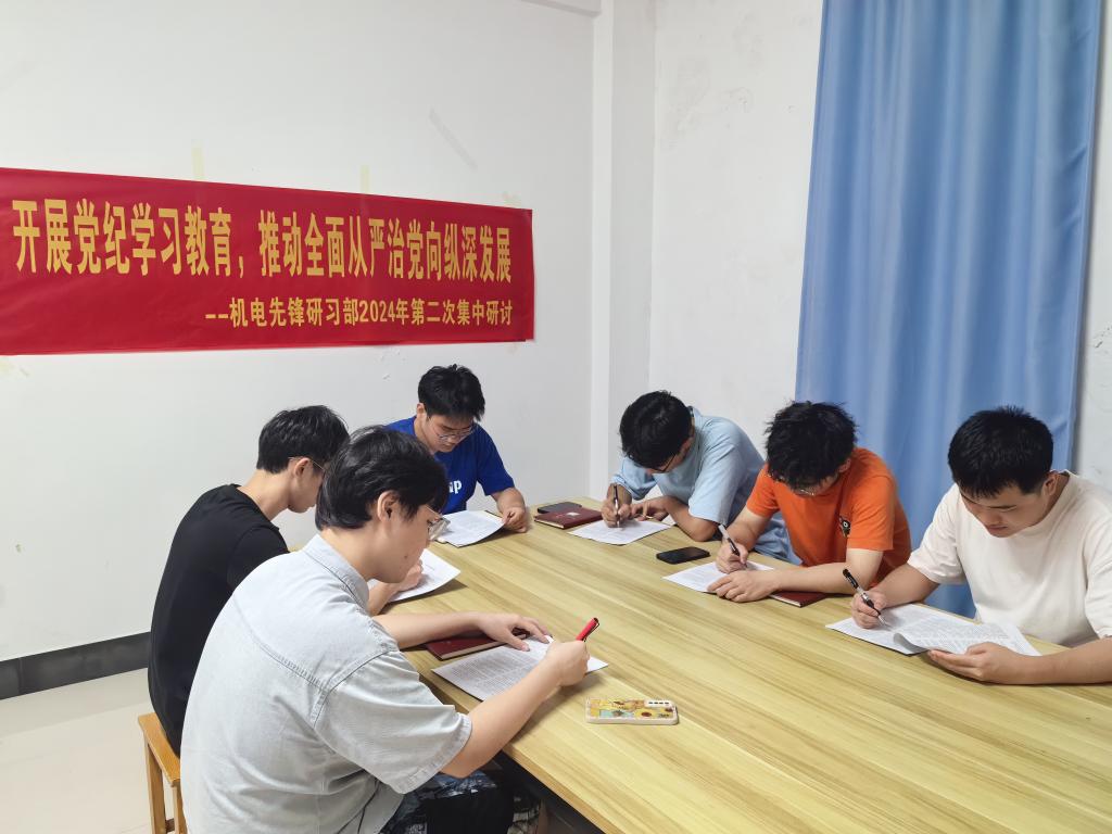 为深入贯彻落实中共中央办公厅《关于在全党开展党纪学习教育的通知》及学院关于党纪学习教育的部署要求,进一步加强学生党员的纪律教育,切实提升其党性修养。2024年4月29日,机电先锋研习部在巡天楼201组织开展2024年第二次集中研讨活动,主题为“开展党纪学习教育,推动全面从严治党向纵深发展”。