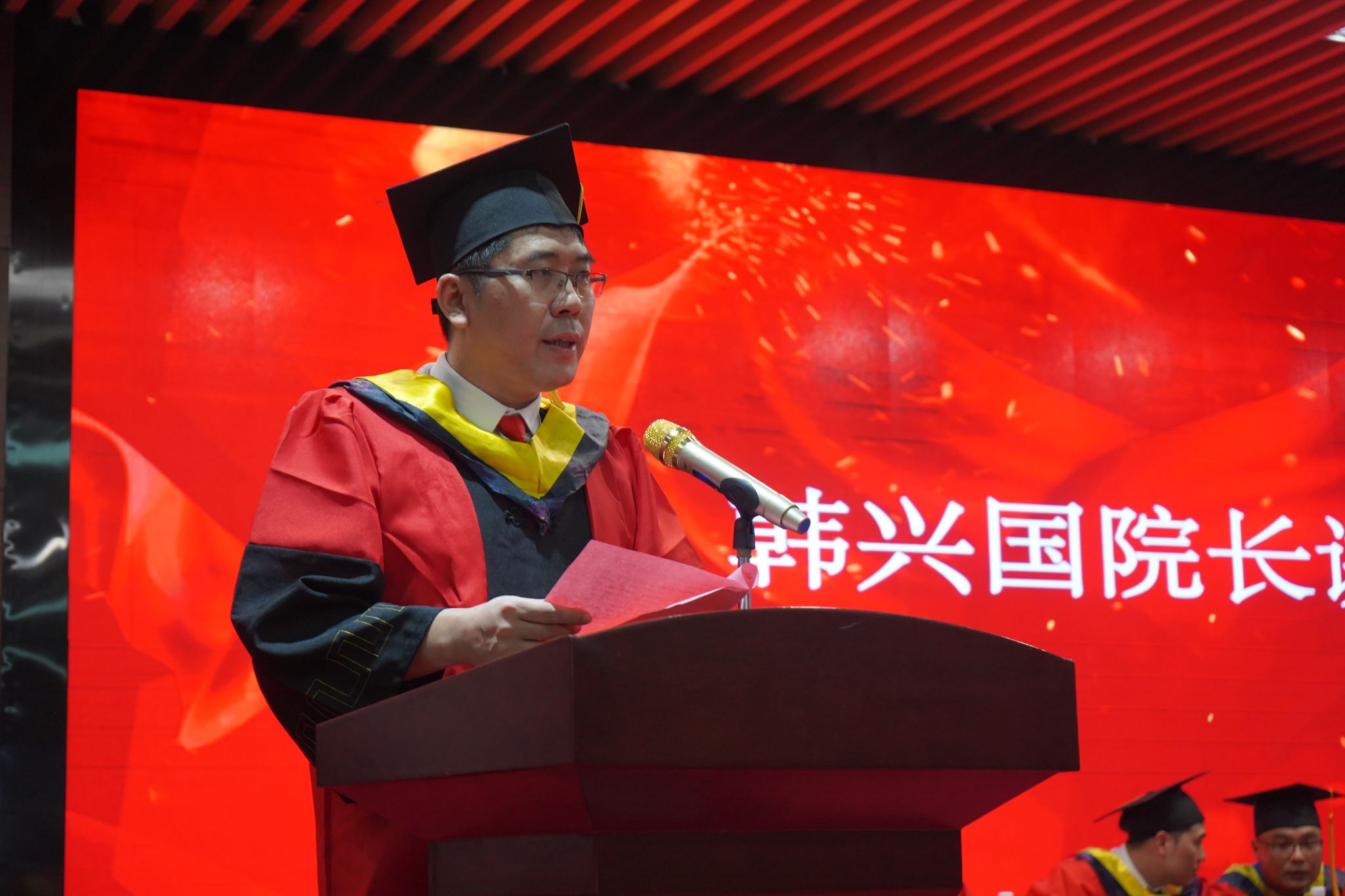 韩兴国代表学院师生向毕业生表达祝贺和祝福,提出保持对专业的热爱、坚定对工作的信心、保持对生活的热爱的期待。