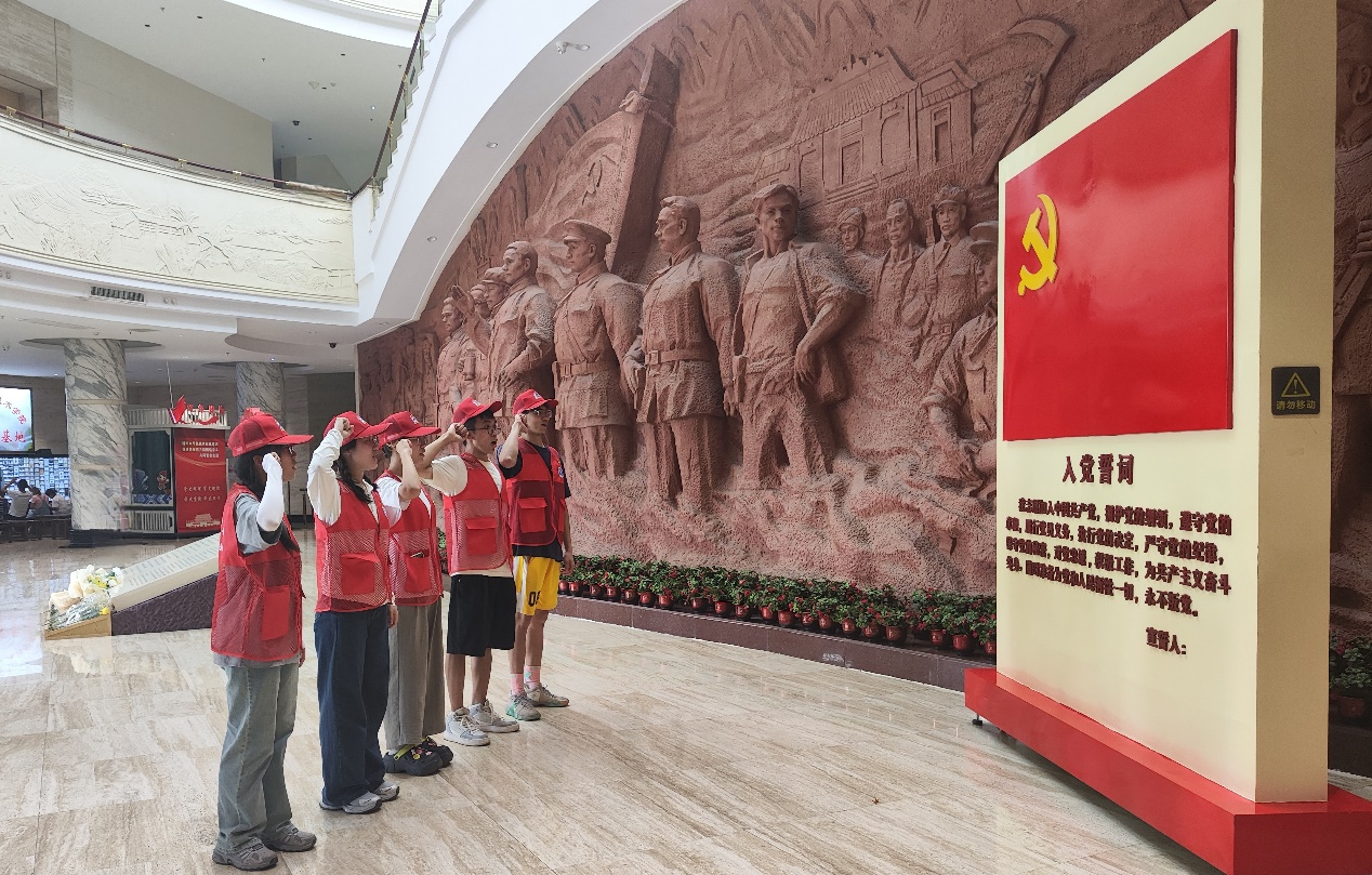 在百色起义纪念馆内,面对熠熠生辉的党旗,团队中的学生党员以最诚挚的心情庄严宣誓。宣誓结束后,看着墙壁上革命先烈们的雕塑,团队成员感慨万千,立志要铭记百色革命历史、不忘初心,传承并弘扬红色精神。