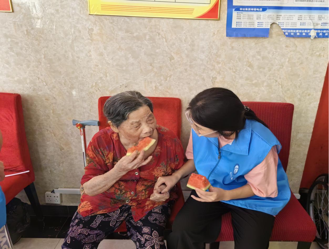 团队成员事先精心挑选了适合老年人的慰问品,其中包括营养丰富、易于消化的食品,如熟透的香蕉、清凉的西瓜以及一些健康小零食,每一份都承载着对老人们深深的关怀与敬意。在院长的引导下,团队成员们逐一走到老人身边,亲手将慰问品递到他们手中,老人们很淳朴,长满皱纹的脸颊上露出了笑容,之后还拉着团队成员的手,一个劲地问学业生活方面的问题,那份温暖与亲情在瞬间弥漫了整个大厅。镜头下,一张张温馨的画面被定格,成为这个夏天最美好的回忆。
